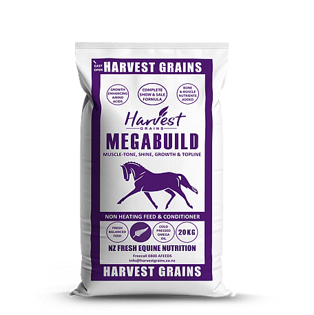 Give your horse the edge with Harvest Grains MegaBuild® — a balanced muesli with tasty calories and essential nutrients designed to enhance topline, shine, condition, and overall wellness.